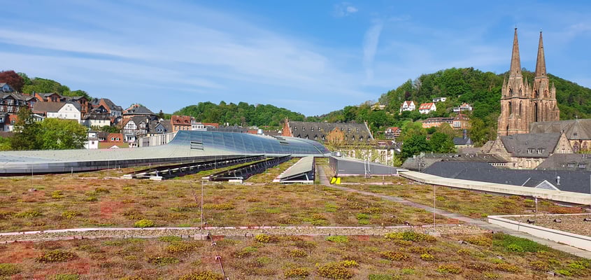 Ein Teil der Dachflächen ist begrünt und zusätzlich mit Photovoltaik-Anlagen ausgestattet. Diese Mehrfachnutzung erhöht die Anforderungen an die Abdichtung, da sowohl die zusätzlichen Auflasten als auch die zahlreichen Durchdringungen berücksichtigt werden müssen. Gerade bei Bibliotheken mit sensibler Nutzung ist daher eine zuverlässige Prüfung der Abdichtung unverzichtbar.