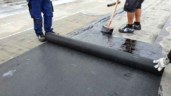 die erste Abdichtungslage bzw. mittels Heißbitumen.