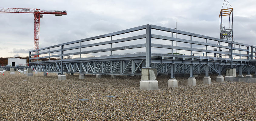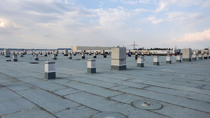 Auf dem Dach befindet sich eine aufwändige Stahlkonstruktion, welche die gesamte für den Rechenzentrumsbetrieb erforderliche Technik trägt. Dazu zählen Pumpen, Kühler und umfangreiche Rohrsysteme. Diese Vielzahl an Aufbauten erfordert höchste Präzision bei der Ausführung der Abdichtung sowie eine dauerhaft zuverlässige Kontrolle aller relevanten Anschlussbereiche.