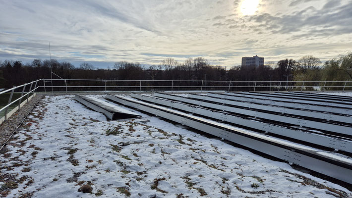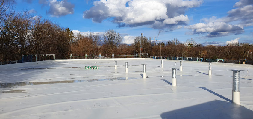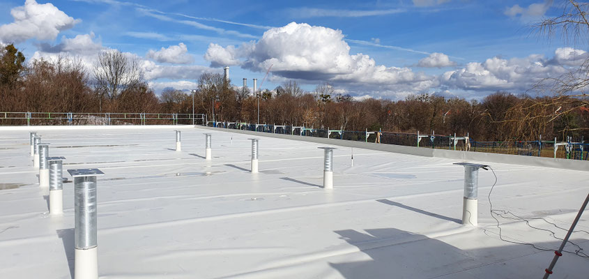 Für das hier mit PV-Anlagen ausgestattete Flachdach ist ein Dichtigkeitsmonitoring von entscheidender Bedeutung. Das Dach ist nicht nur der Witterung ausgesetzt, sondern trägt zusätzlich die Last von PV-Modulen, Installationen und Wartungspersonal. Ein kontinuierliches Monitoring ermöglicht die frühzeitige Erkennung von Undichtigkeiten, verhindert Schäden an der Dachkonstruktion und schützt die darunterliegenden Gebäudebereiche. So lassen sich Reparaturen gezielt planen, Ausfallzeiten minimieren und die Lebensdauer des Daches sowie der installierten Anlagen deutlich verlängern.