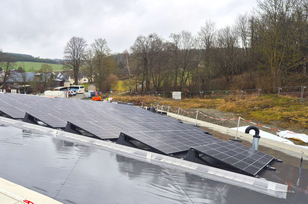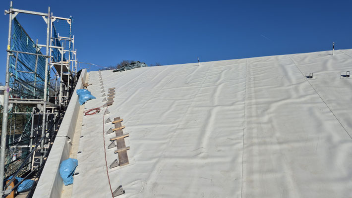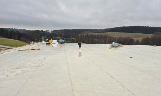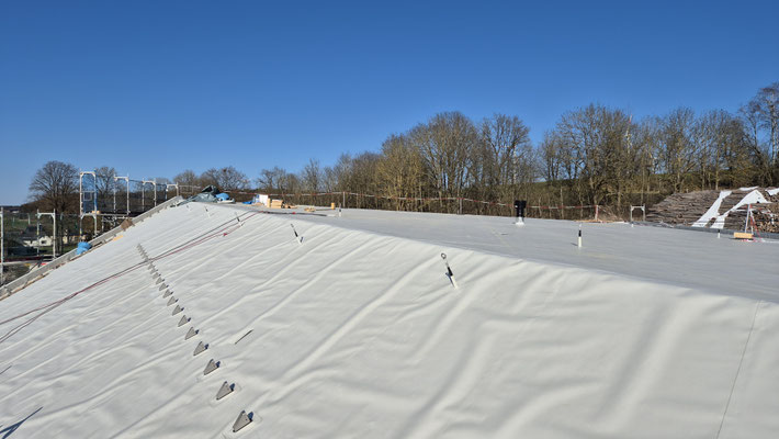Eine besondere Herausforderung bei der Installation war das teilweise starke Dachgefälle. Um Beschädigungen oder Undichtigkeiten frühzeitig zu erkennen, wurde die Dachabdichtung systematisch und in kurzen Abständen mehrfach überprüft – eine entscheidende Vorgehensweise, um bereits vor der Auflastaufbringung eine sichere und dichte Abdichtung zu gewährleisten.